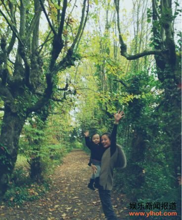 赵薇抱着女儿在小径中散步开心挥手面对镜头